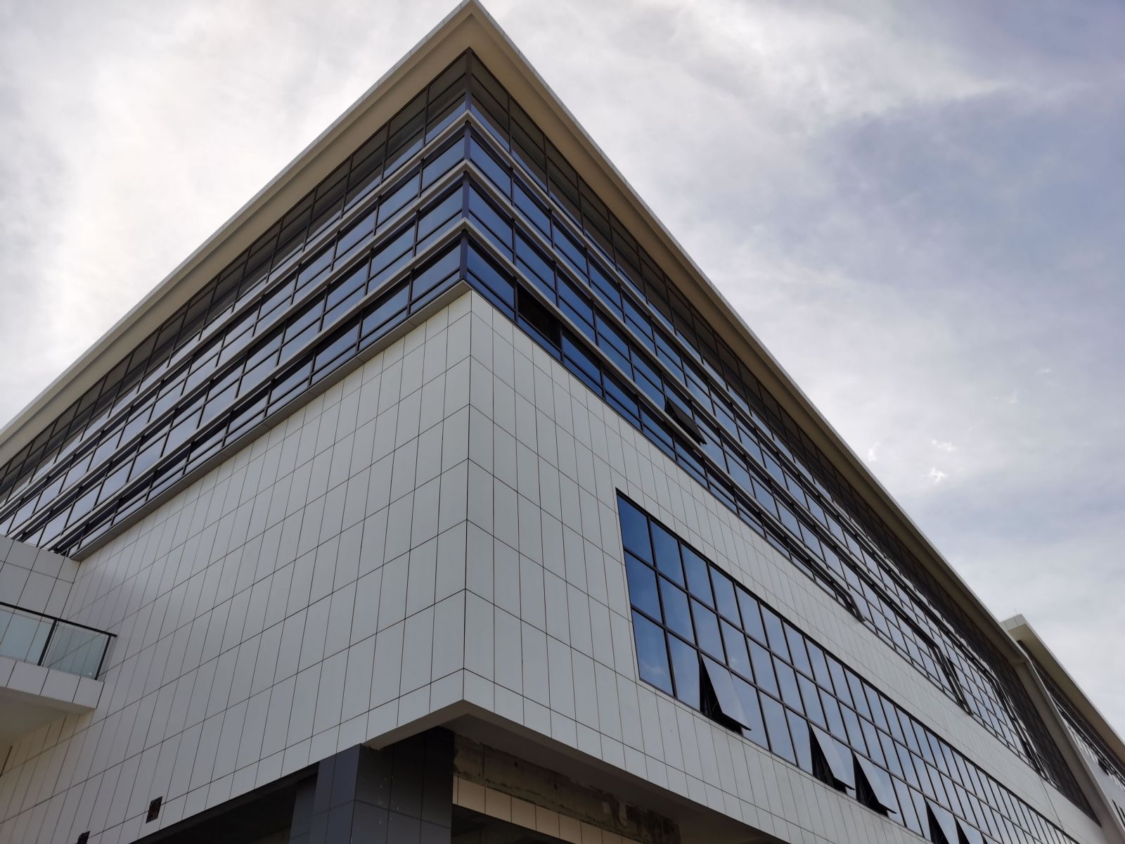 整棟建筑外立面使用白色、灰色陶瓷薄板鋪貼裝飾。