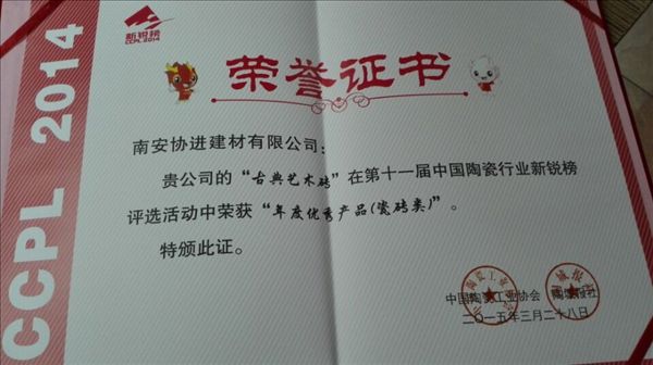 熱烈祝賀協(xié)進(jìn)陶瓷古典藝術(shù)磚在號(hào)稱(chēng)“中國(guó)陶瓷行業(yè)奧斯卡”評(píng)選活動(dòng)中榮獲年度優(yōu)秀產(chǎn)品獎(jiǎng)。